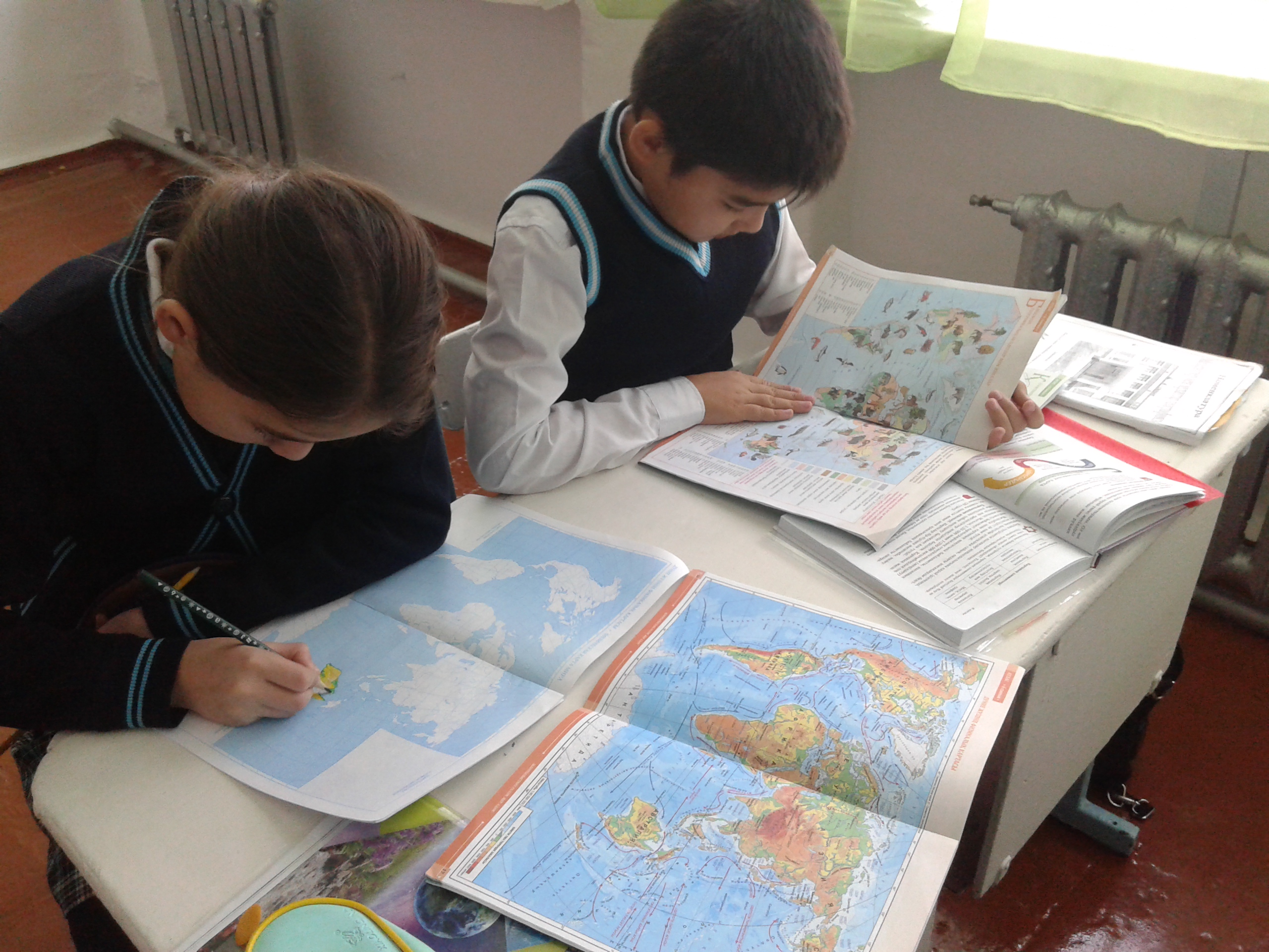 6 - сынып оқушылары жаратылыстану пәнінің "Географиялық карта және шартты белгілерді жіктеу" сабағында географиялық номенклатура тапсырып, кескін картамен жұмыс жасауда . Мақсаты : карталар , олардың түрлері, әрбір картаның өзіне тән белгілері туралы түсінік қалыптастыру. Масштабына қарай карталар қалай жіктеледі, осыны қарастыру, олардың жасалу жолдары, маңызы туралы білім беру